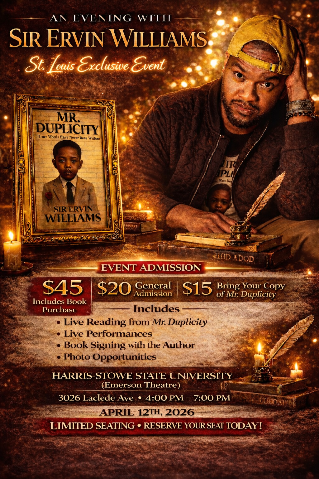 Join author, actor, and creative visionary Sir Ervin Williams for an unforgettable evening of storytelling, reflection, and artistic expression.